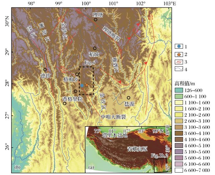 中甸地区位于川西高原南部,青藏高原的东南缘,地理坐标为99°45′~100°20′E,27°40′~28°32′N (图1和图2)。地貌特征呈现出沿着金沙江分布着巨大且保存完好的高海拔、低地势的层状地貌(Tian et al.,2014),受到河流侵蚀作用,河谷呈现“V”型。中甸地区缺失侏罗纪—白垩纪地层,表明该区可能在晚侏罗世就从海平面上升为古陆(Leng et al.,2018)。