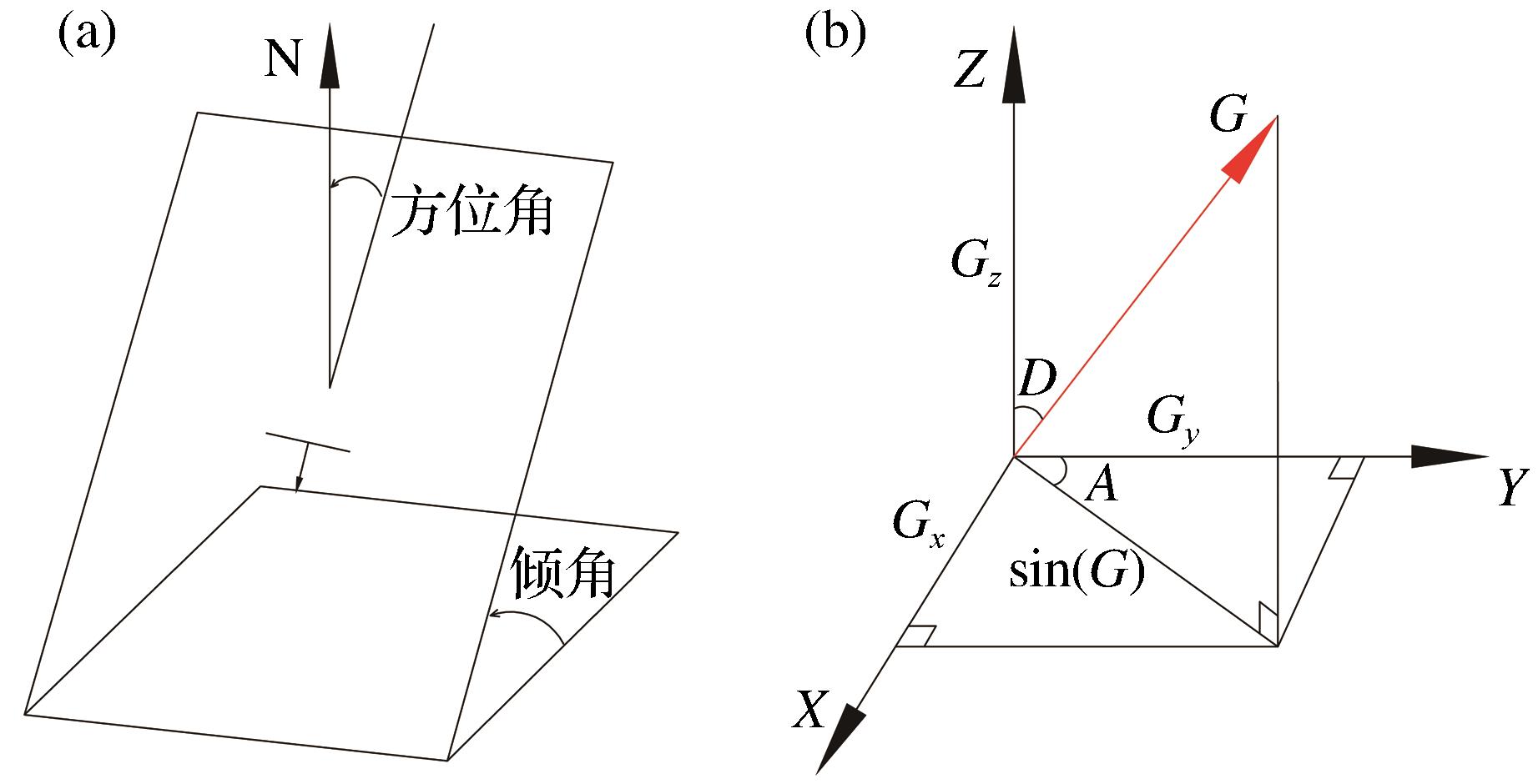 | 图1 梯度数据和方位信息关系图 (a)产状信息(方位角和倾角);(b)梯度矢量在3个坐标轴上的投影 |
