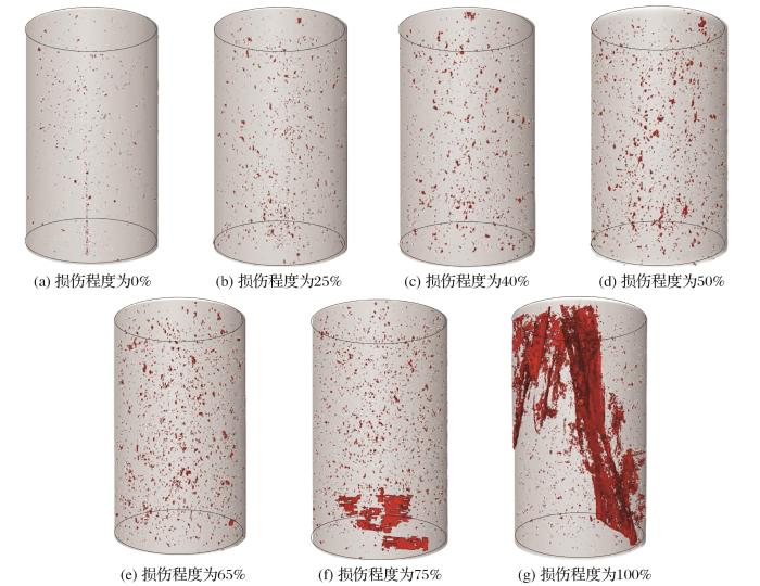 ... 损伤程度是表征材料或结构劣化的量度,直观上可以理解为微裂隙或孔洞在整个材料中所占体积的百分比.通过声波筛选出一批致密度接近的岩样,最大程度地减小岩样强度差异带来的影响.岩样预损,即使完整岩样内部产生裂隙,裂隙的存在改变了岩石的稳定性,降低了其强度参数(Luo et al.,2019).岩石损伤程度的定义主要有2种:弹性模量法和超声波波速法(Hassan et al.,2020).Eberhardt et al.(1999)在岩石单轴压缩试验中发现,Pink Lac du Bonnet花岗岩在压缩强度为峰值强度的39%时开始萌生微裂隙,在压缩强度为峰值强度的75%时开始破坏.为定量研究岩样预损指标,采用轴向应力σ与抗压强度σc的比值作为损伤程度D的度量指标.即: ...