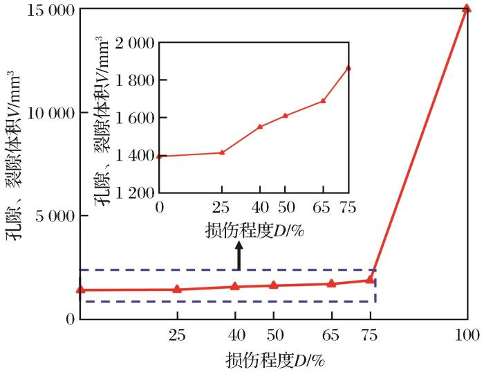 损伤程度是表征材料或结构劣化的量度,直观上可以理解为微裂隙或孔洞在整个材料中所占体积的百分比。通过声波筛选出一批致密度接近的岩样,最大程度地减小岩样强度差异带来的影响。岩样预损,即使完整岩样内部产生裂隙,裂隙的存在改变了岩石的稳定性,降低了其强度参数(Luo et al.,2019)。岩石损伤程度的定义主要有2种:弹性模量法和超声波波速法(Hassan et al.,2020)。Eberhardt et al.(1999)在岩石单轴压缩试验中发现,Pink Lac du Bonnet花岗岩在压缩强度为峰值强度的39%时开始萌生微裂隙,在压缩强度为峰值强度的75%时开始破坏。为定量研究岩样预损指标,采用轴向应力σ与抗压强度σc的比值作为损伤程度D的度量指标。即:
