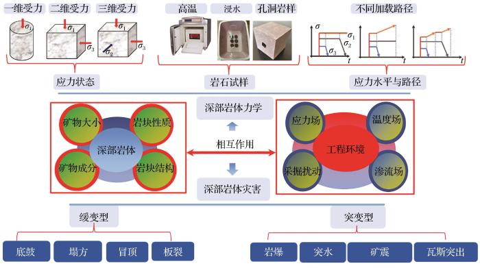 ... 根据套孔应力解除法所得的地应力测试结果,我国地下硬岩工程的埋深H每增加1 000 m,最大主应力σ1、中间主应力σ2和最小主应力σ3分别增加约42.8 MPa、25.3 MPa和16.3 MPa,因此地下工程的埋深H越大,工程围岩所赋存的应力水平越高(Du et al.,2020a),如图2(a)~2(c)所示.而地下工程所赋存的应力状态主要可划分为3类:孤立矿柱以及巷道交叉处的围岩处于一维应力状态下,如图2(d)和图2(e)所示,而巷道近场围岩和远场岩体分别处于二维和三维应力状态下,如图2(f)和图2(g)所示.总之,深部工程围岩处于一维、二维和三维3种不同的应力状态下,分别对应室内单轴压缩、双轴压缩和真三轴压缩试验中岩样的应力状态(Du et al.,2020b,2019).深部岩体和浅部岩体所处的应力水平明显不同,进而造成深部岩体的破坏特性与浅部围岩差异明显.不同的应力状态和应力水平经常会导致深部工程围岩发生与常规破坏失稳(冒落和片帮等)有别的非常规破裂现象,如应变型岩爆及板裂等,常具有簇状平行宏观破裂面(Du et al.,2016,2015;Li et al.,2011;Mogi,1967).目前,非常规破裂的发生机制尚不明确,且难以有效防治.鉴于此,本文通过开展不同应力状态及应力水平下的岩石力学试验,系统研究了硬岩非常规破裂机制与强度特性. ...