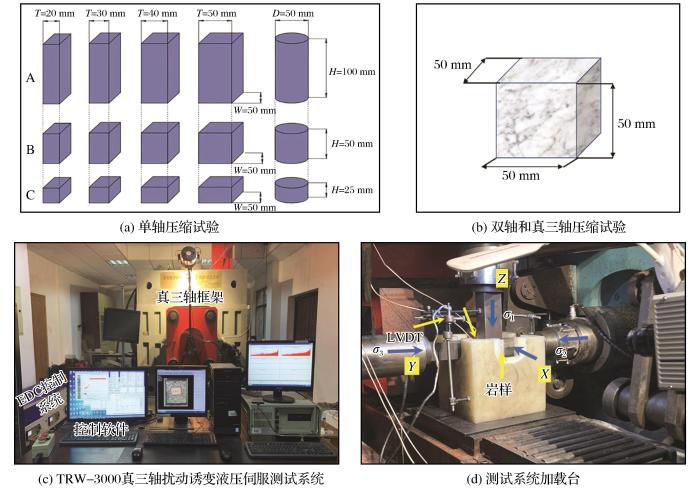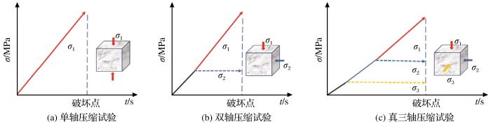 根据套孔应力解除法所得的地应力测试结果,我国地下硬岩工程的埋深H每增加1 000 m,最大主应力σ1、中间主应力σ2和最小主应力σ3分别增加约42.8 MPa、25.3 MPa和16.3 MPa,因此地下工程的埋深H越大,工程围岩所赋存的应力水平越高(Du et al.,2020a),如图2(a)~2(c)所示。而地下工程所赋存的应力状态主要可划分为3类:孤立矿柱以及巷道交叉处的围岩处于一维应力状态下,如图2(d)和图2(e)所示,而巷道近场围岩和远场岩体分别处于二维和三维应力状态下,如图2(f)和图2(g)所示。总之,深部工程围岩处于一维、二维和三维3种不同的应力状态下,分别对应室内单轴压缩、双轴压缩和真三轴压缩试验中岩样的应力状态(Du et al.,2020b,2019)。深部岩体和浅部岩体所处的应力水平明显不同,进而造成深部岩体的破坏特性与浅部围岩差异明显。不同的应力状态和应力水平经常会导致深部工程围岩发生与常规破坏失稳(冒落和片帮等)有别的非常规破裂现象,如应变型岩爆及板裂等,常具有簇状平行宏观破裂面(Du et al.,2016,2015;Li et al.,2011;Mogi,1967)。目前,非常规破裂的发生机制尚不明确,且难以有效防治。鉴于此,本文通过开展不同应力状态及应力水平下的岩石力学试验,系统研究了硬岩非常规破裂机制与强度特性。
