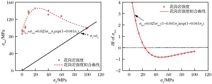 ... 中间主应力σ2与花岗岩双轴抗压强度σbcs和强度增长率IR的关系曲线分别如图8(a)和图8(b)所示.分析图8得到如下主要结论:①随着σ2的增大,花岗岩σbcs呈现先增大后减小的趋势,与文献(Feng et al.,2019;Chang et al.,2000;Haimson et al.,2000;Labuz et al.,1993;Barton,1976)的测试结果一致,而IR则呈现先减小而后小幅增大的趋势;②当IR=0时,对应的σ2为25.2 MPa,此时σbcs出现最大值,说明当σ2从0增加至25.2 MPa时,花岗岩的强度增加最明显,前人研究文献中该数值往往比较大,分别为38 MPa、105 MPa和51 MPa(Chang et al.,2000;Haimson et al.,2000;Labuz et al.,1993);③当σ1和σ2同时加载时,σbcs的数值接近或略高于σucs,验证了中间主应力效应;④基于指数函数对双轴抗压强度进行了拟合,发现双轴抗压强度与中间主应力具有明显的指数关系. ...