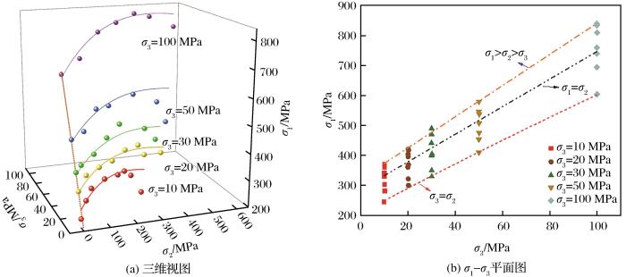 Relationship between failure mode and intermediate principal stress σ2 of granite under biaxial compression test(Du et al.,2021)Fig.94 真三轴压缩试验4.1 强度规律