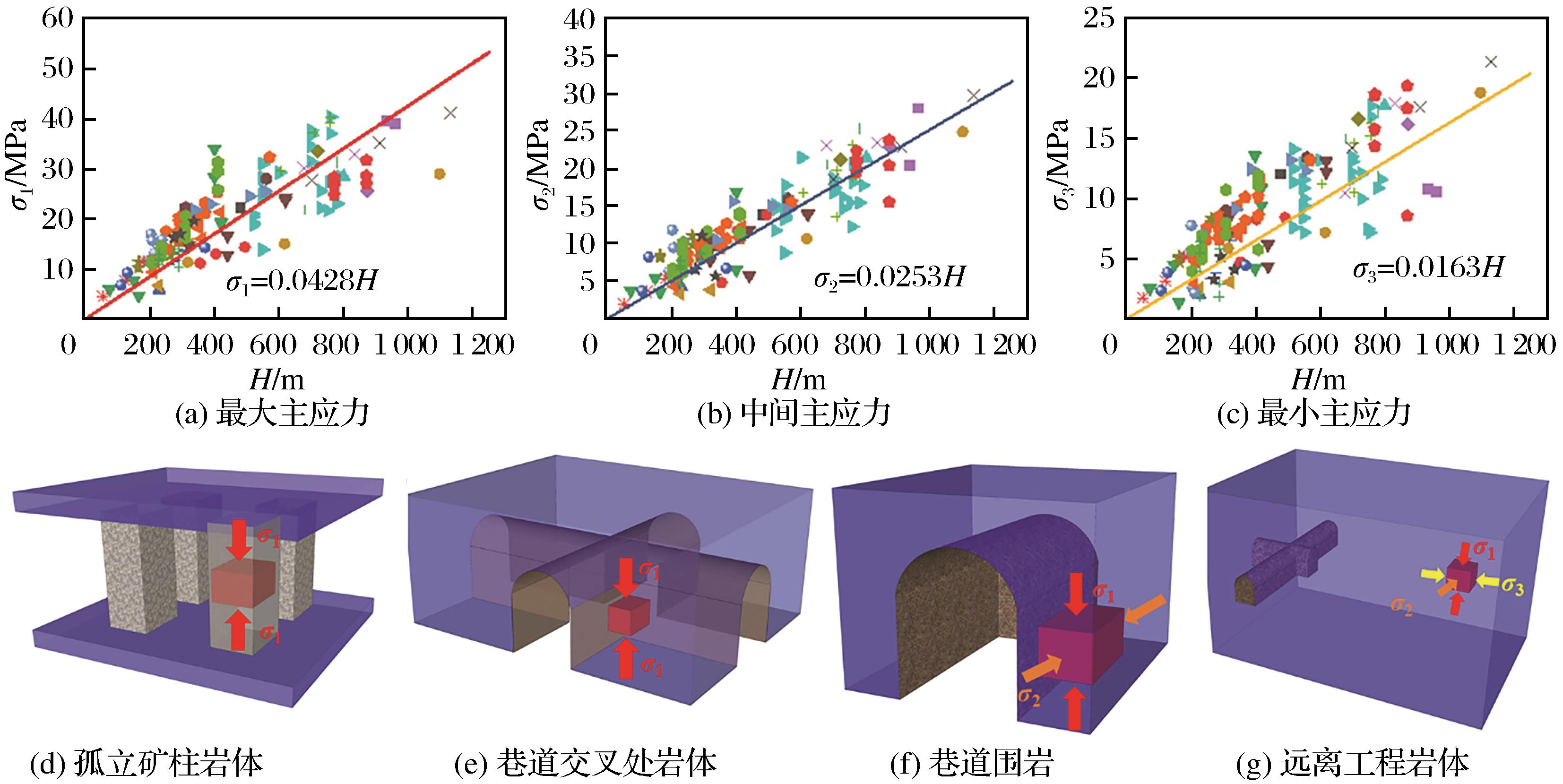 | 图2 我国硬岩地下工程原岩应力水平及不同位置岩体的应力状态[图(a)~(c)的数据来源于 |