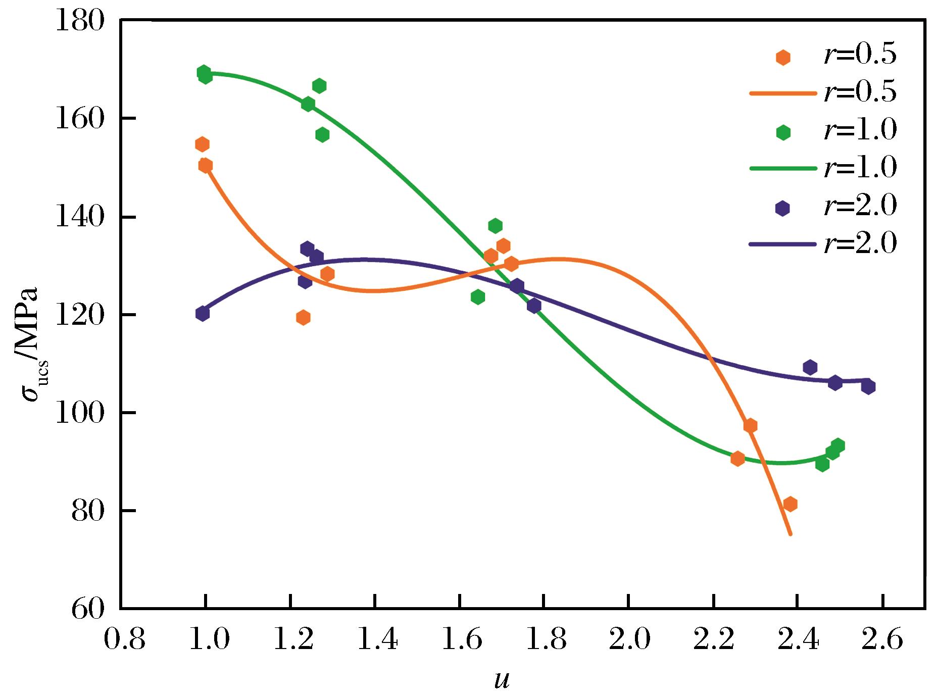 | 图6 花岗岩单轴抗压强度σucs与宽厚比u和高宽比r的关系曲线 |