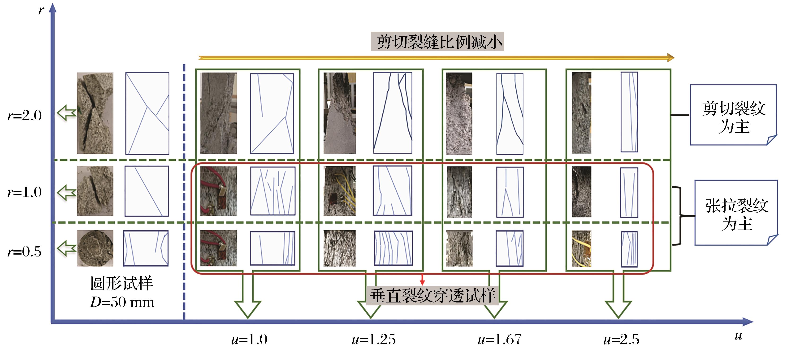 | 图7 单轴压缩试验下花岗岩破坏模式与高宽比r和宽厚比u的关系 |