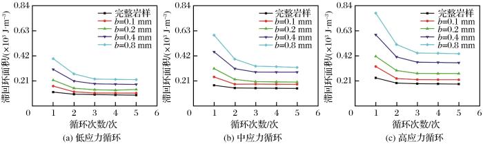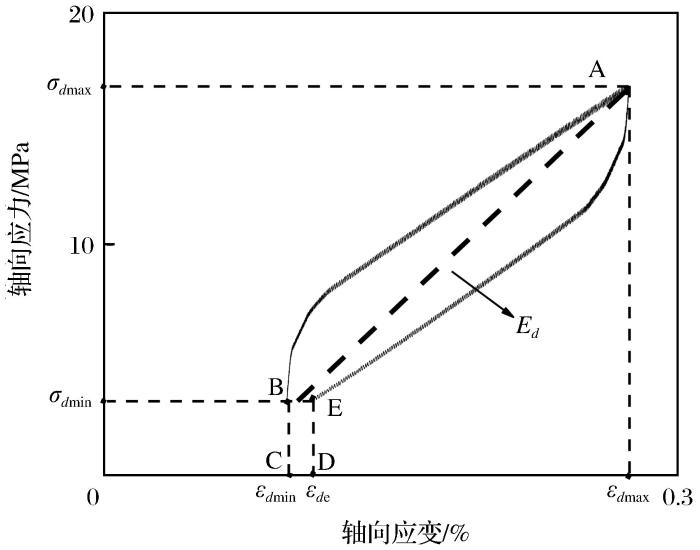 ... 滞回环面积是指卸载曲线和加载曲线之间形成的一个近似封闭环线的面积.之所以会出现2条曲线不重合的情况是因为试样内部存在裂纹缺陷,在循环荷载作用下部分能量的耗散导致卸载曲线不会沿着加载曲线原路返回.滞回环面积大小反映了类岩石能量的消散以及内部损伤的大小,并且二者呈正相关关系,即滞回环面积越大,类岩石能量消散越多,其内部损伤程度也越大.类岩石试件循环加载滞回环如图5所示.滞回环面积由2个部分组成,包括ABEA曲线部分面积和BCDEB面积,ABEA曲线部分面积是近似闭合滞回圈面积,其中BCDEB面积是考虑了残余变形和滞后效应部分的能量消耗(邓华锋等,2016).滞回环的面积表现为循环加卸载滞回能Δwp的大小: ...