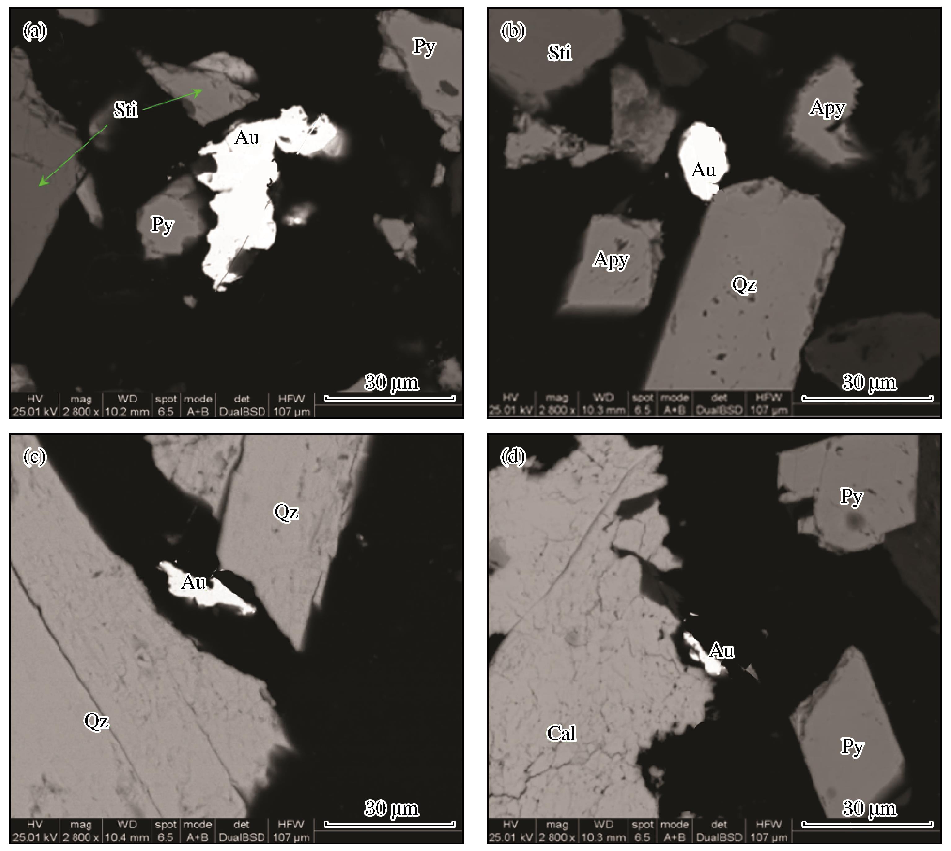 | 图2 矿石中自然金的典型嵌布特征 (a)自然金嵌布于辉锑矿与黄铁矿颗粒间;(b)自然金嵌布于辉锑矿与毒砂颗粒间;(c)自然金嵌布于石英等脉石矿物的裂隙中;(d)自然金嵌布于方解石与黄铁矿颗粒间Au-自然金;Py-黄铁矿;Sti-辉锑矿;Apy-毒砂;Qz-石英;Cal-方解石 |