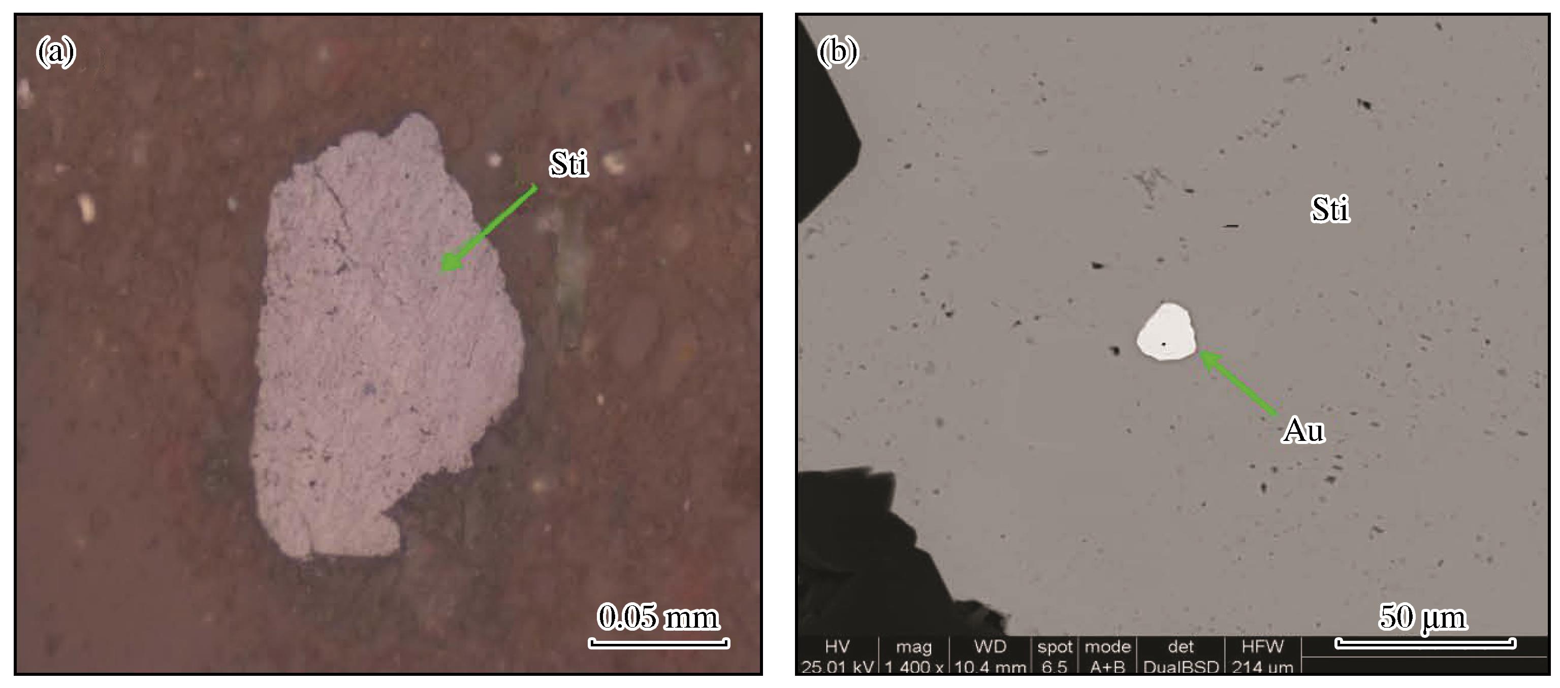| 图3 矿石中辉锑矿的典型嵌布特征 (a)辉锑矿的光学显微图像;(b)辉锑矿的扫描电镜图像Sti-辉锑矿;Au-自然金 |