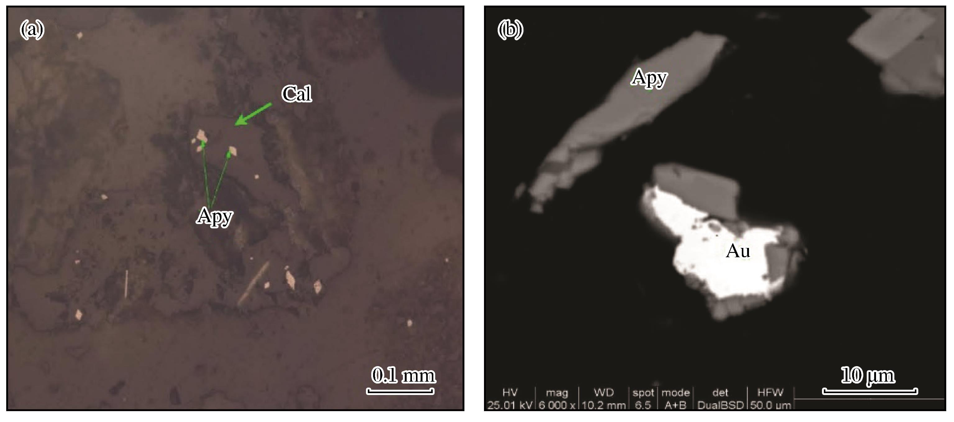 | 图4 矿石中毒砂的典型嵌布特征 (a)毒砂的光学显微图像;(b)毒砂的扫描电镜图像Cal-方解石;Apy-毒砂;Au-自然金 |