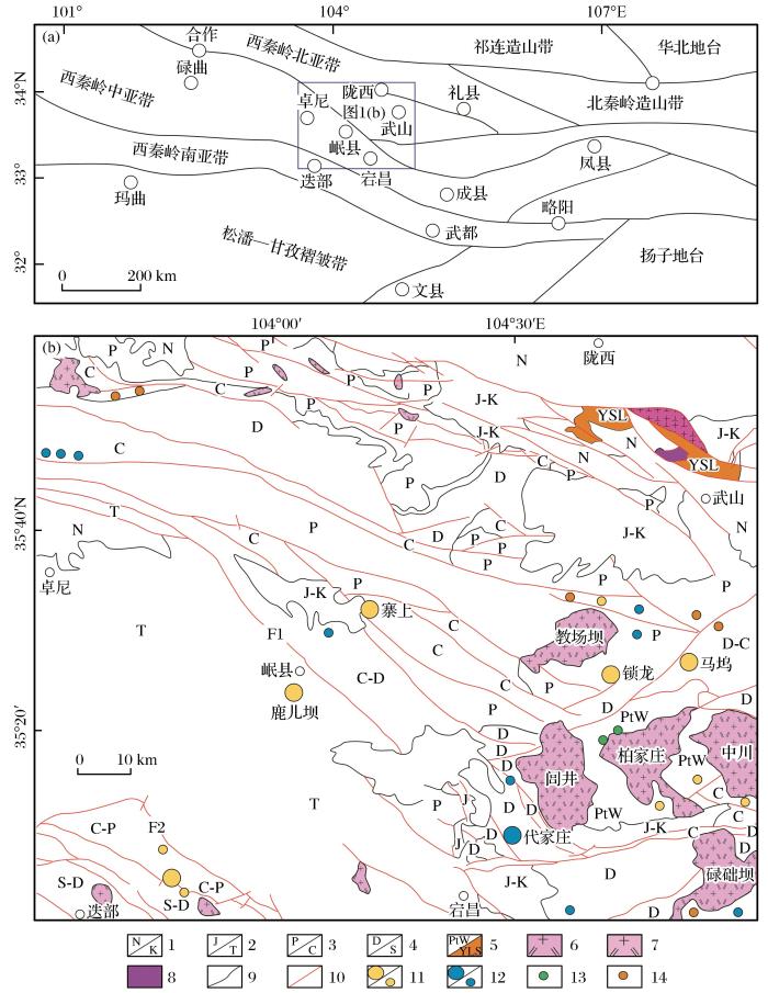 ... 岷礼成矿带位于甘肃省岷县—礼县一带,大地构造位置处于西秦岭造山带中段,是陆内造山—成矿耦合的关键部位.区内复杂的地质构造背景和晚三叠纪大规模的岩浆侵入,造就了巨大的成矿规模和丰富的成矿类型(刘建宏等,2006).目前岷礼成矿带已经取得了一系列找矿勘查成果,已发现众多具有一定规模的金矿,如寨上、锁龙和马坞等金矿床,以及一系列金、铜、铅—锌和钨—锡矿化点.然而,对于区域上金多金属矿化的控矿因素尚存有争议,总体上持有2种观点:一种是岩体控矿(陈衍景等,2004;Liu et al.,2015);另一种是构造控矿(Deng et al.,2016;Goldfarb et al.,2019). ...