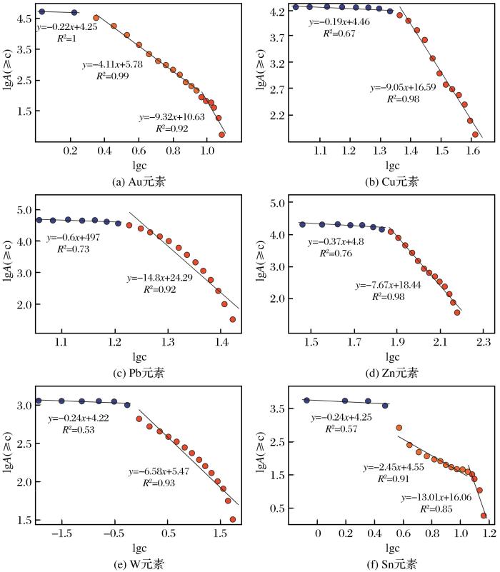 ... C-A分形模型(浓度—面积分形模型)定量刻画了元素的富集程度和空间分布的复杂程度,基于地球化学元素非正态分布的数学特性,能够将重要的矿化异常从地质背景中分离,强化异常的显示(Cheng et al.,1994).本研究基于该理论计算得到Au、Cu、Pb、Zn、W和Sn的分形模式(图4).元素的浓度—面积分形模型服从以下数学关系式: ...