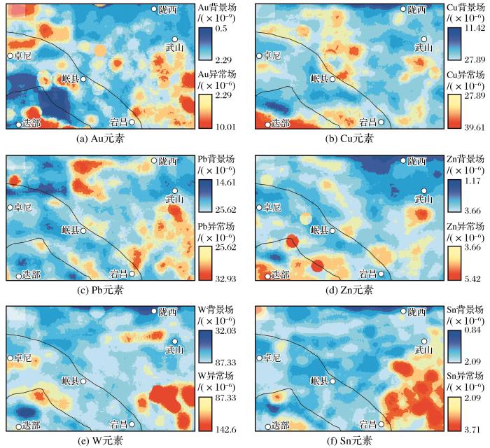 ... 本研究基于C-A分形模型,实现了对岷礼成矿带Au、Cu、Pb、Zn、W和Sn 6种成矿元素的背景区和异常区的分离(图4和图5).其中,Cu、Pb、Zn和W元素具有背景区和异常区2个地球化学场[图4(b)~4(e)].Au和Sn元素具有多个层次的地球化学场[图4(a),图4(f)],表明Au和Sn元素具有更高的富集程度(柯贤忠等,2015;向中林等,2019).北亚带Au、Cu、Pb和Zn异常区大致可划分为2类:一类异常与区域晚三叠纪大规模侵入岩体有关,出露有锁龙金矿、马坞金矿和代家庄铅锌矿以及若干矿化点;另一类异常与区域复杂断裂—褶皱系统(岷县—宕昌断裂、迭部背斜)有关,出露有寨上超大型金矿和若干矿化点[图1,图5(a)~5(d)].W和Sn异常与“五朵金花”岩体具有很强的空间相关性,出露众多矿化点.中亚带和南亚带虽然有一定矿化元素异常显示,但只有南亚带迭部地区产出有金矿[图1(b)].以上单元素异常的发现,表明研究区南部迭部背斜具有良好的多金属找矿前景. ...