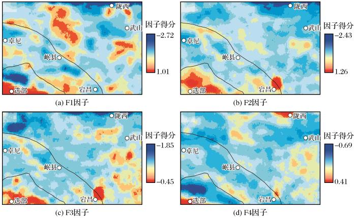 ... 对水系沉积物地球化学数据进行因子分析处理后,能够有效识别区域地质背景与矿化的地球化学场(Afzal et al.,2016;Asadi et al.,2014;Yang et al.,2017).第一主因子F1(Co-Cr-Cu-Ni-Ti-V-Zn)受岩性控制,代表了区域上晚古生代变质岩系和元古宙结晶基底,F1元素组合含有Cu和Zn,铜、铅锌矿基本分布于晚古生代地层中F1高因子得分地区,表明区域上铜、锌矿化可能部分来源于该套地层[图6(a)].第二主因子F2(As-Hg-Sb)代表了常见的低温元素组合,主要受岷县—宕昌断裂和南亚带迭部背斜的控制,可能是浅成低温热液活动的记录[图6(b)].第三主因子F3(Bi-Sn-W)代表了常见的高温成矿元素组合,主要受北亚带“五朵金花”岩体和南亚带迭部背斜的控制,表明迭部背斜可能存在多期次(低温与高温)的岩浆热液活动,目前已知的“五朵金花”岩体附近存在大量钨—锡矿化,推测在迭部背斜深部具有钨—锡矿的找矿潜力[图6(c)].第四主因子F4(Ba-Pb)主要代表铅矿化,陇西县高因子得分可能是受金属元素向低海拔汇水盆地迁移的影响(图2),总体来说F4因子受北亚带“五朵金花”岩体和迭部背斜的控制,北亚带已发现大量有价值的铅锌矿化点,可以看出迭部地区多金属成矿潜力巨大[图6(d)].第五主因子F5只有Au元素,表明岷礼成矿带金矿化可能是相对独立事件,与已知的晚三叠纪岩浆侵入事件无太大关联,已有大量的矿床地球化学证据表明锁龙和马坞金矿是与“五朵金花”岩体有密切成因联系的(类)卡林型金矿(刘坤等,2014;刘天航,2017),但寨上金矿与已知岩体较远,考虑到其巨大的成矿规模,认为构造控矿的作用更明显. ...