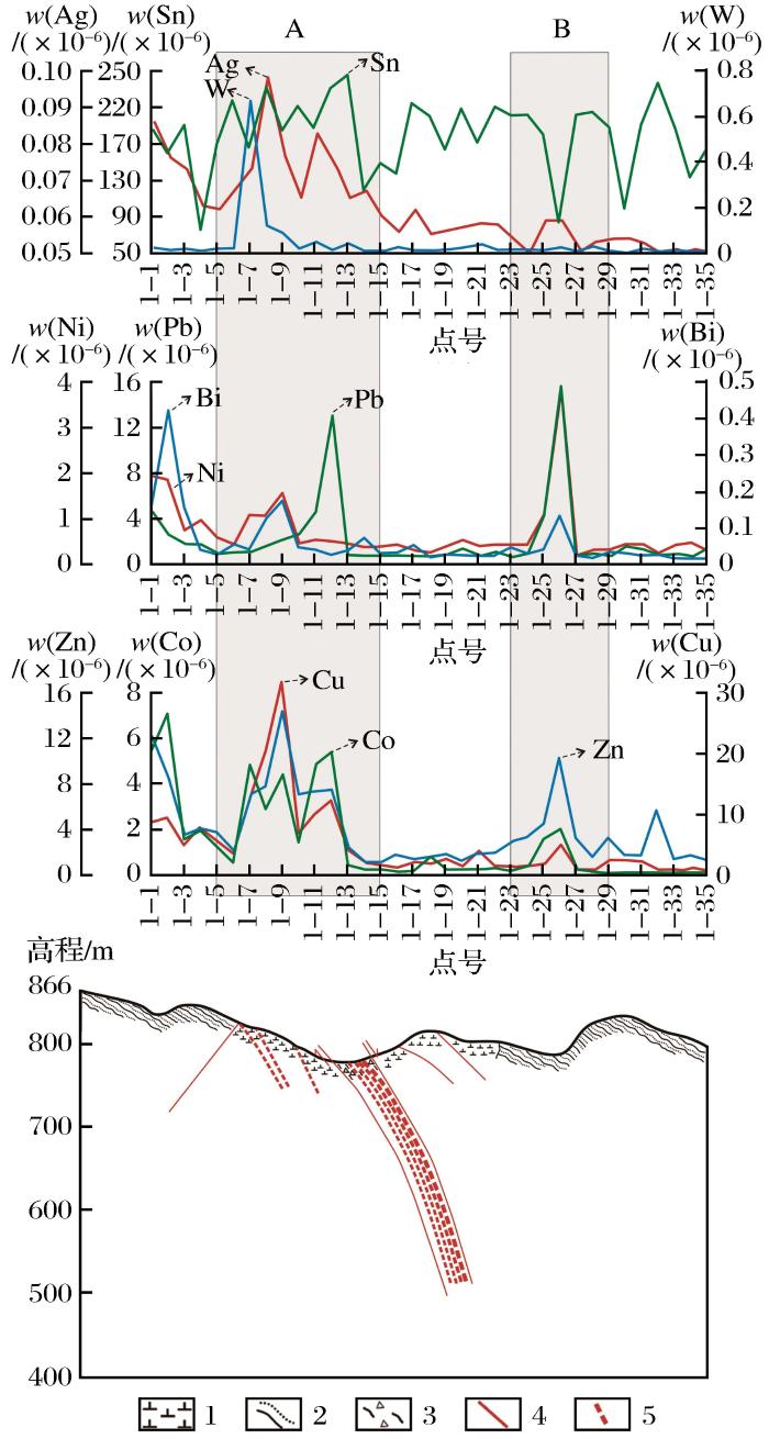 为了验证地电化学方法的应用效果(Shmakin,1985;Leinz et al.,1998),包括各元素含量特征变化对各地质体及地质情况的反映,选取了已有工程控制的记洞湾锡铜多金属矿区0线剖面进行方法的可行性研究(Hamilton,1998;Smee,1998)。试验结果表明,在已知矿体中均能检测出清晰的异常现象(图2)。