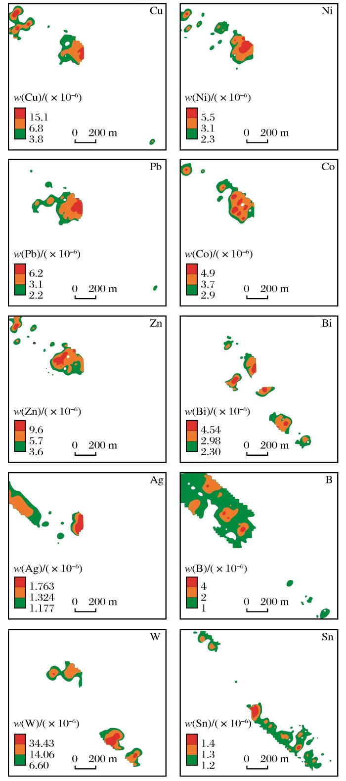 (2)通过对记洞湾矿区的地电提取数据进行统计分析,并结合异常平面特征分析,得出4个元素组合:F1(Cu-Ni-Co-Pb-Zn)、F2(Ag-Bi)、F3(W-Sn)和F4(B)。从平面异常图可以得出:单元素异常明显、强度大且连续性好;组合元素异常套合性好,分带明显。