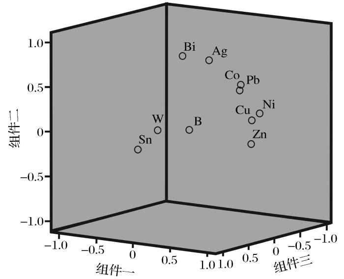 F3因子为W-Sn元素组合,W和Sn为高温成矿元素,且均为钨钼族元素,化学活动性相对较弱,常富集在酸性岩中,与高温中酸性侵入体及其热液活动有关。通过对已知矿床的分析,认为该组合代表了云英岩锡钨成矿阶段。
