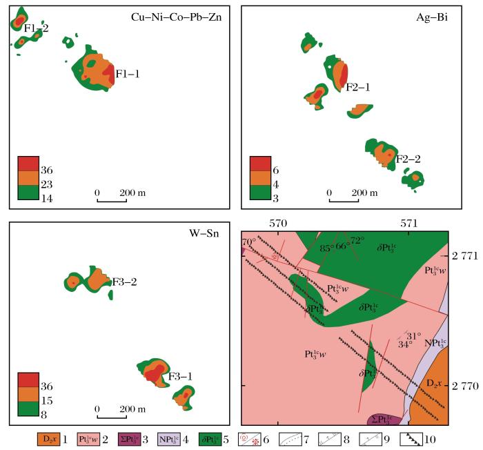 (1)Cu-Ni-Co-Pb-Zn组合元素异常:主要分布于研究区北西侧,根据异常规模和空间位置,可划分为2个异常区(F1-1和F1-2)。其中,F1-1异常区位于研究区中部靠北西一侧,处于四堡群文通组与石英闪长岩岩体接触带附近,受NE向和NW向断裂带控制,该异常规模大,清晰度高,且异常浓度分带明显;F1-2异常区位于研究区北西侧,处于四堡群文通组与花岗闪长岩岩体接触带附近,受NE向断裂带控制,该异常规模较小,清晰度高,且异常浓度分带明显。