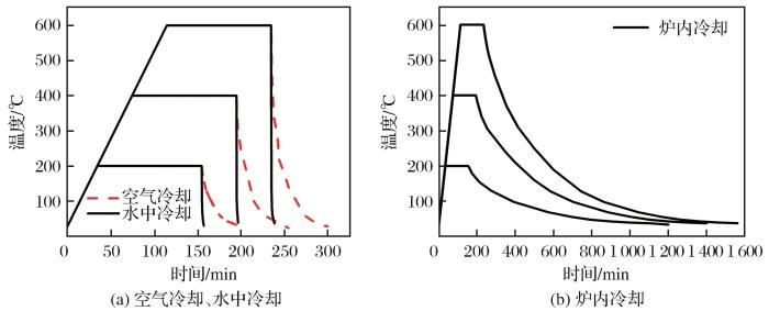在加热过程中,每60 s读取并记录加热炉内部的测温计读数;在冷却过程中,使用红外线温度计(深圳华谊仪表科技有限公司生产,型号:PM6530D)对试件的温度进行测量,其中炉内冷却和空气冷却每60 s测量一次,水中冷却每30 s测量一次,得到加热及冷却过程中试件的温度变化如图3所示。