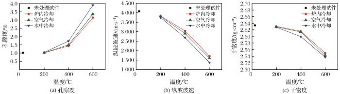 根据以上观测结果,当加热温度为200 ℃时,温度对花岗岩没有明显的损伤效应,且水中冷却和空气冷却产生的温度冲击没有对花岗岩造成明显损伤。当加热温度升高至400 ℃时,温度冲击对花岗岩的损伤效应开始显现,且水中冷却造成的温度冲击损伤大于空气冷却造成的温度冲击损伤。当加热温度升高至600 ℃时,温度冲击造成的损伤效应更加明显,其中,水中冷却的试件受到严重损伤,且直接被分解为多块不规则体,空气冷却试件受损伤程度也大于炉内冷却试件受损伤程度。据此可知,随着加热温度和降温速率的升高,花岗岩受损伤程度增大。