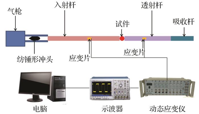 利用改进的分离式霍普金森杆系统(SHPB)对温度冲击后的试件进行动态拉伸试验(Zhou et al.,2011;Zhao et al.,2000)。如图5所示,试验系统的加载装置包括气枪、纺锤形冲头、入射杆、透射杆、吸收杆和数据处理系统。杆件采用高强度40Cr合金制成,密度为7 821 kg/m3,弹性模量为233 GPa,屈服强度为800 MPa。杆件直径为50 mm,入射杆长度为2 000 mm,透射杆长度为1 500 mm,吸收杆长度为500 mm。在入射杆和透射杆上分别安装一个应变片,用以接收杆上的应变信号。试验开始时,冲头撞击入射杆,在入射杆内产生半正弦波,部分波在入射杆与试件的接触面上反射,其余波通过试件到达透射杆。同时,杆件的应变通过应变片和应变仪被示波器所记录,再传输至电脑进行分析。