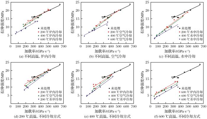 值得注意的是,花岗岩试件加热至600 ℃后的拟合强度曲线与加热至400 ℃后的拟合强度曲线之间的距离,大于加热至400 ℃后的拟合强度曲线与加热至200 ℃后的拟合强度曲线之间的距离[图7(a)~7(c)]。例如图7(a)中,加热至600 ℃后经炉内冷却的试件强度与加热至400 ℃后经炉内冷却的试件强度差别较大,而加热至400 ℃后经炉内冷却的试件强度与加热至200 ℃后经炉内冷却的试件强度差别较小。造成这种现象的可能原因是当温度升高至573 ℃时,花岗岩内的石英发生α-β的相变,这种内部结构的变化加剧了花岗岩的损伤程度(Dolino et al.,1982)。