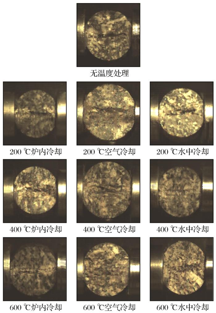 当经400 ℃高温加热的试件受到冲击时,试件两端出现的微小裂纹数量变多,形成了较大的三角形缺口(与200 ℃对比),且水中冷却试件两端缺口略大于空气冷却与炉内冷却试件两端缺口。当经600 ℃高温加热的试件受到冲击时,试件中部贯穿裂纹走势变得更加曲折,说明发生了较多的沿晶破坏,冲击过程中试件两端出现较多微小裂隙,破坏后两端缺口尺寸更大。水中冷却试件经冲击试验后被分解为多块不规则体,空气冷却试件两端缺口也大于炉内冷却试件两端缺口。