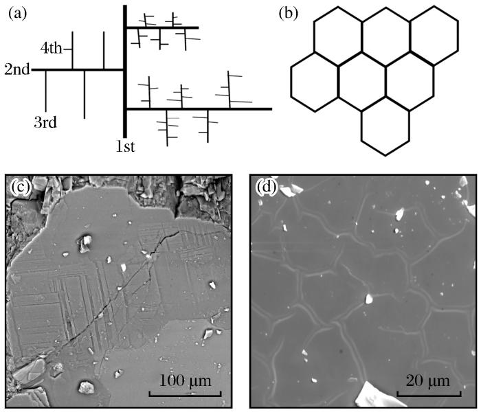 (a)、(b)Hall et al.(2014)发现的温度冲击所产生的正交裂缝和多边形裂缝;(c)、(d)本次试验涉及温度冲击的试件中发现的正交裂缝和多边形裂缝