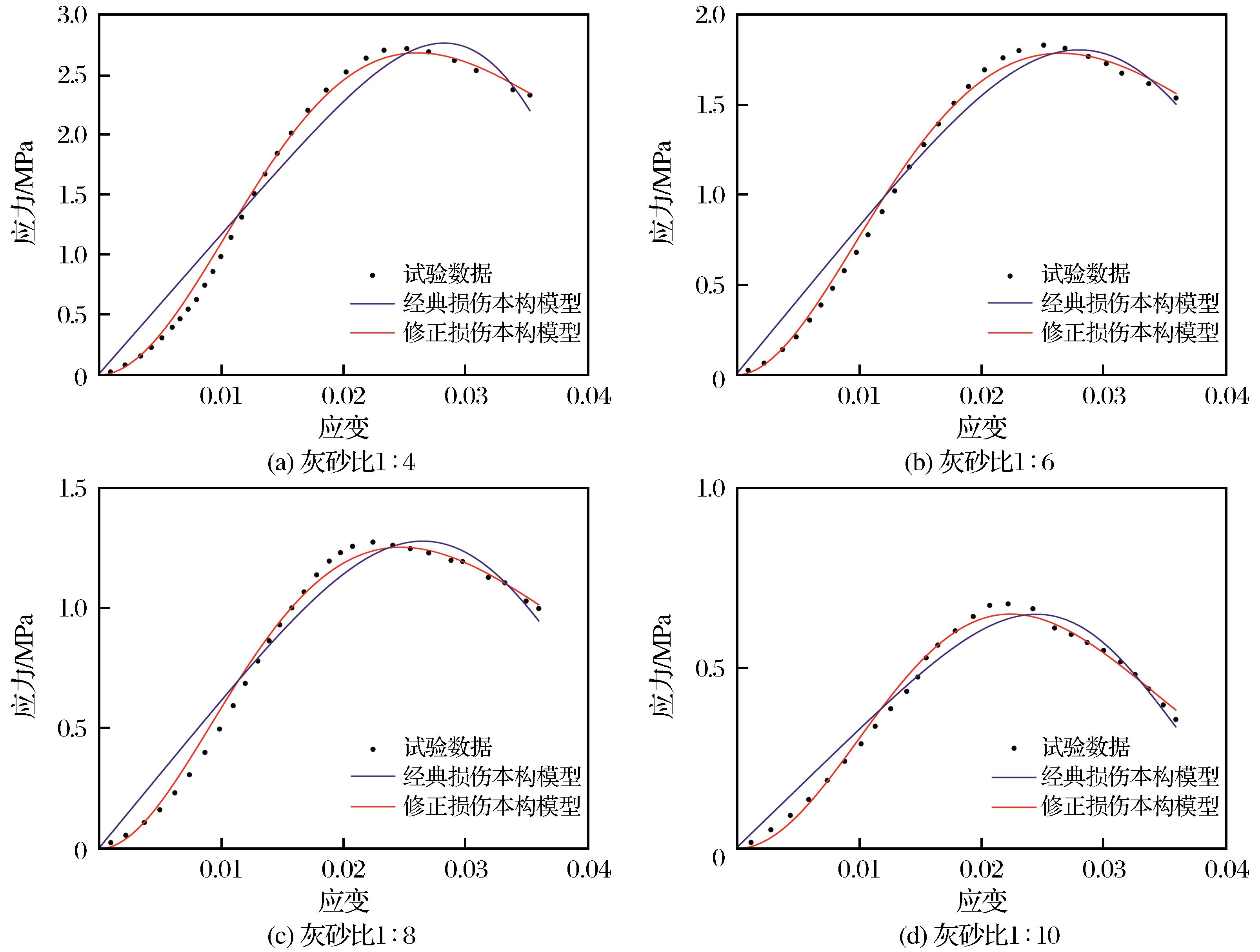 | 图4 不同灰砂比全尾砂充填体单轴压缩试验数据及拟合曲线 |