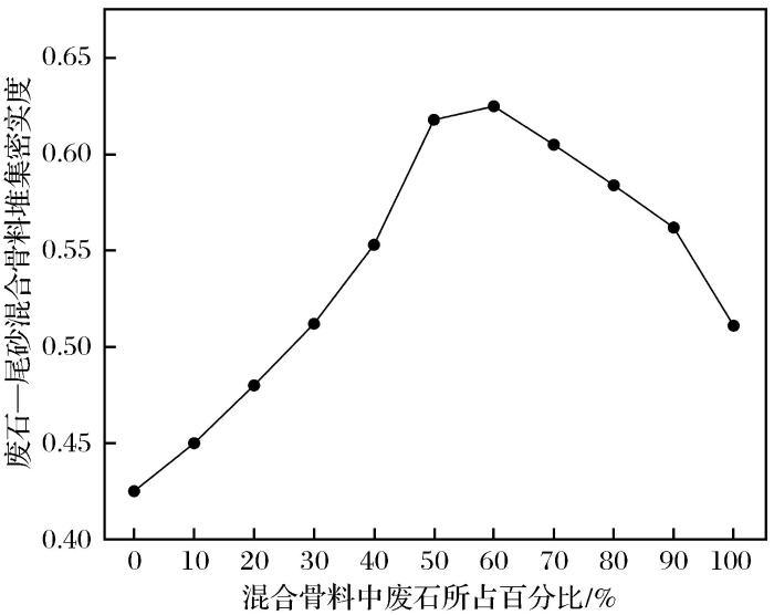 废石—尾砂混合骨料堆集密实度与废石含量之间的关系曲线