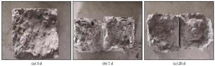 为了进行胶结充填体强度测试和破裂面观察,对充填料浆取样制备试块进行强度试验和料浆浓度测试。采用10 cm×10 cm×10 cm三联模具制备试块。不同浓度的试块强度测试结果见表7和表8。由表7和表8可知,当水泥添加量为260 kg/m3时,2种配比的混合骨料充填体强度均达到设计强度,且废石与尾砂配比为6∶4的胶结充填体强度整体高于配比为5∶5的胶结充填体。图4显示了混合骨料胶结充填体试块压裂破坏断面。由图4可知,试块中仍有尾砂和胶结剂的团块没有被搅拌均化,存在搅拌不均匀现象,表明充填料浆搅拌系统制浆质量不高。分析其原因有2个方面:一是水泥下料不均匀,冲板流量计计量不准;二是一段搅拌不能实现混合骨料充填料浆的充分搅拌。因此,有必要采用二段活化搅拌。试块中粗粒级废石分布均匀,无分层离析现象。