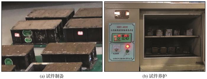 将坍落度达到20 cm的膏体材料,按照《建筑砂浆基本性能试验方法标准》(JGJ/T 70-2009)(中华人民共和国住房和城乡建设部,2009)中规定的砂浆立方体抗压强度试验标准进行抗压强度试验,将材料充填到尺寸为70.7 mm×70.7 mm×70.7 mm的标准模具中制备试件。每组配比制备试件10个,放入养护区,经过(24±1) h养护成型后脱模。养护区模拟井下采空区恒温潮湿的环境,温度为19~21 ℃,相对湿度在90%以上。利用CMT5205微机控制电子万能试验机进行抗压强度试验,分别测量养护1 d、3 d、7 d、14 d和28 d充填体的单轴抗压强度,分析不同配比条件下充填体强度变化规律。测量过程采用位移控制,速度为0.5 mm/min。每组试验重复2次,取其抗压强度的平均值。图3为第3组材料坍落度试验图,图4为试件制备及养护情况,图5为第5组材料7 d抗压强度试验图。