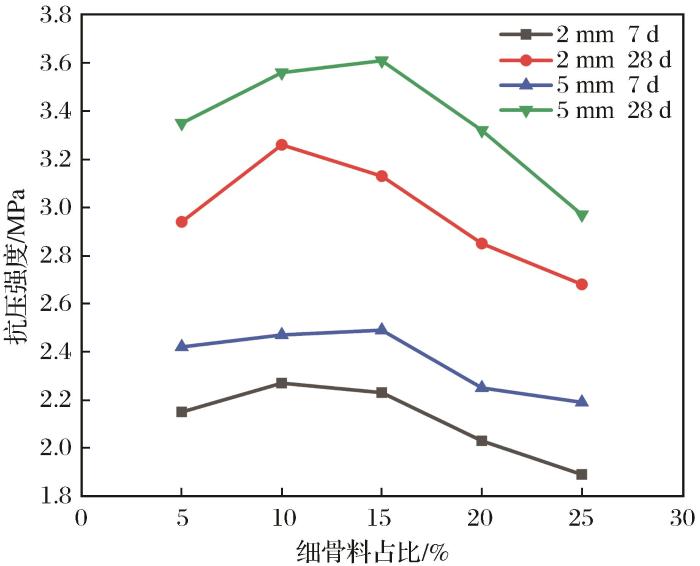 掺混细骨料后,料浆浓度和底渣配比发生变化,进而影响充填体强度,其中底渣配比是主要影响因素。由于底渣破碎之后,粒径变小、颗粒不规则程度加剧,比表面积增加,使其吸水性增强,导致掺混细骨料之后料浆坍落度达到20 cm时的浓度随着细骨料掺混量的提高而有所降低,不利于充填体强度发展。破碎后的底渣作为细骨料按一定比例参与膏体材料制备时,可以对原状底渣颗粒间隙进行填充。混合材料颗粒结构如图9所示,原状底渣作为粗骨料,破碎后底渣作为细骨料,流化床飞灰和粉煤灰作为微骨料,由于补充了粒径较小的破碎后底渣,使充填体内部孔隙率降低,骨料支撑作用提高,增加了底渣与灰浆的接触面积,提高了材料和易性。然而,当细骨料粒径过低或掺混量过大时,骨料支撑作用减弱,料浆浓度降低明显,使得充填体强度降低。