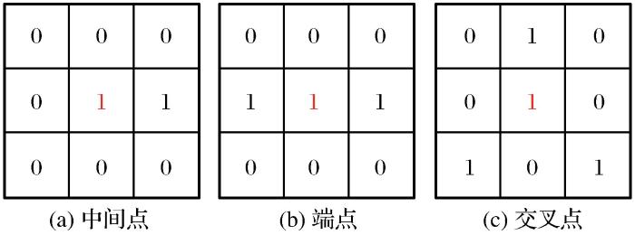 (2)针对第2个问题,设计了一种基于中心点八邻域范围的搜索算法,避免了逐行逐列搜索,减少用时。该算法将待处理的点划分为三类,即中间点、端点和交叉点,如图4所示。创建TypeMatrix类型矩阵来表示点的类型,该矩阵存储4个整形数值,即0、1、2、3。其中,0表示该点类型为背景点,不需要处理;1表示该点类型为中间点,2表示该点类型为端点,3表示该点类型为交叉点。