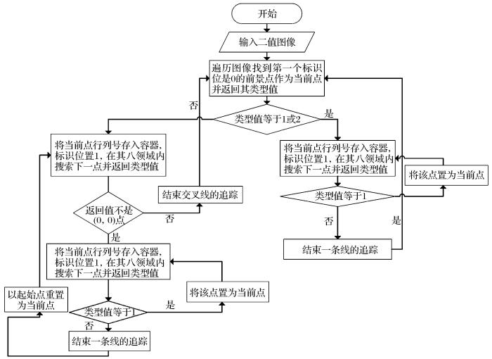 整个连接算法被设计为3个函数,即点查找函数、线追踪函数和主处理函数。点查找函数是对于当前点,按照一定的顺序搜索其八邻域,找到第一个值为255且尚未被查找过的点并返回该点的坐标;线追踪函数是对于当前点,查找该点所属的线条,内部迭代调用点查找函数,终止条件是当前点不为端点、交叉点或(0,0)点;主处理函数负责查找所有的线条,其内部迭代调用线追踪函数。算法流程如图5所示。