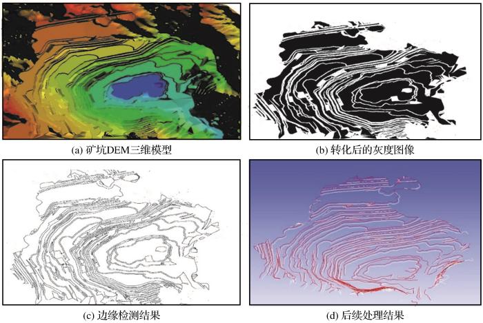 矿区DEM三维模型、转化后的灰度图像、边缘检测结果及后续骨架提取抽稀处理得到的最终坡面顶底线如图7所示。通过计算高程值标准差,将DEM三维模型转化为灰度图像,巧妙地将原数据由三维数据转化为二维图像,使问题转化为图像处理领域经典的边缘检测任务。
