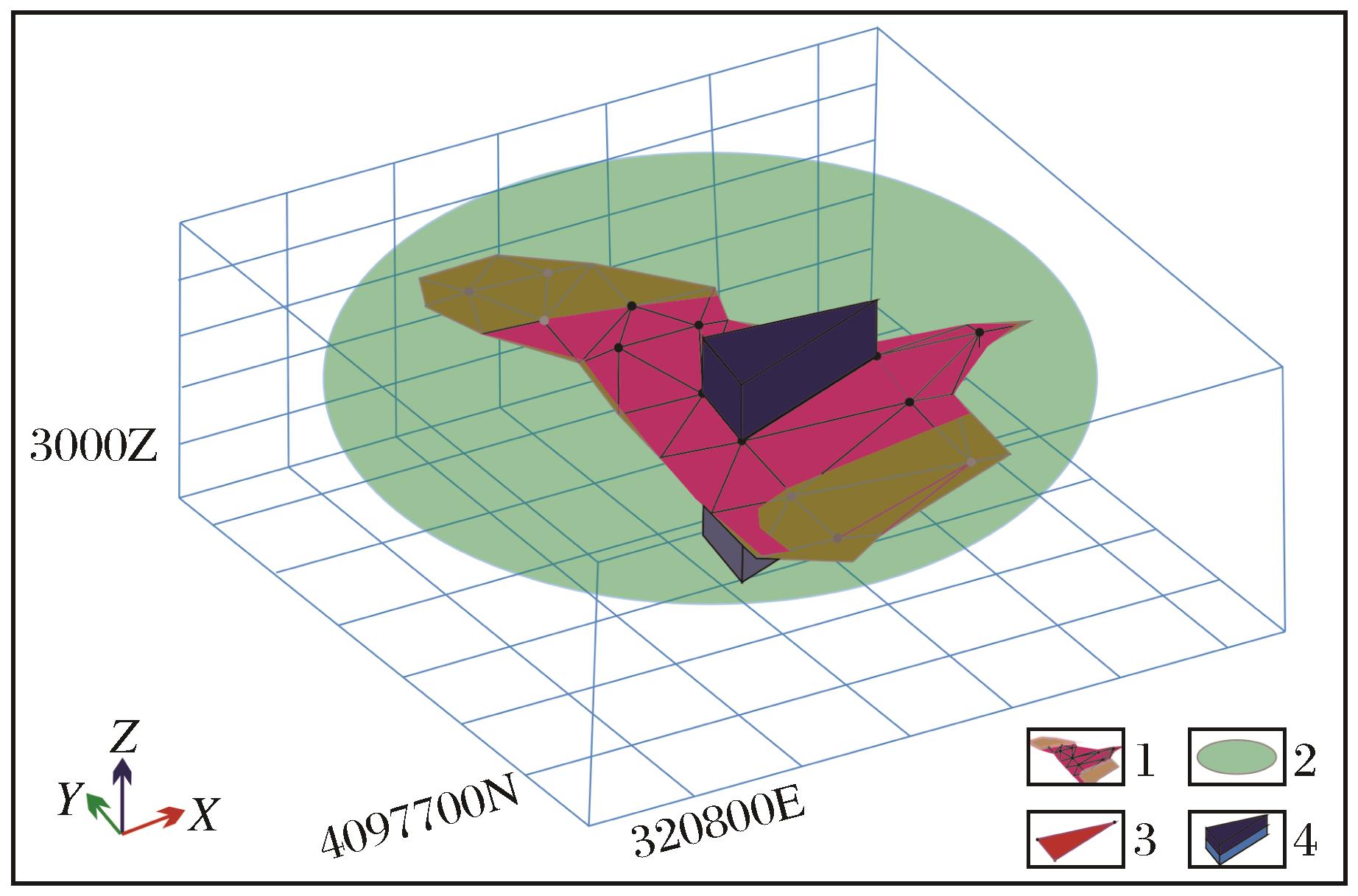 | 图6 矿体控矿中心点形成的三角形扩展示意图 1.矿体中心面;2.总体产状平面;3.控矿中心点形成的三角形;4.三角形垂直于总体产状面扩展形成三棱柱 |