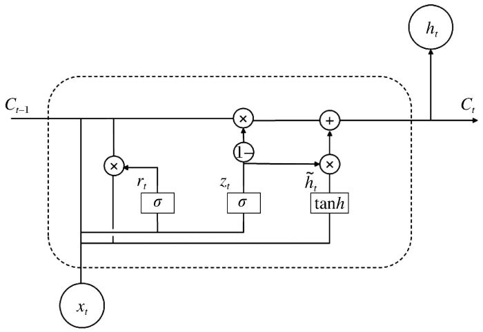 图2为GRU隐藏层结构示意图。更新门控制的前一时刻信息与当前时刻信息的影响成反比,即前一时刻的信息对当前时刻的影响随着更新门值的增大而减小;重置门控制与前一时刻信息的接收成正比,即前一时刻的信息接收随着重置门值的增大而增多。