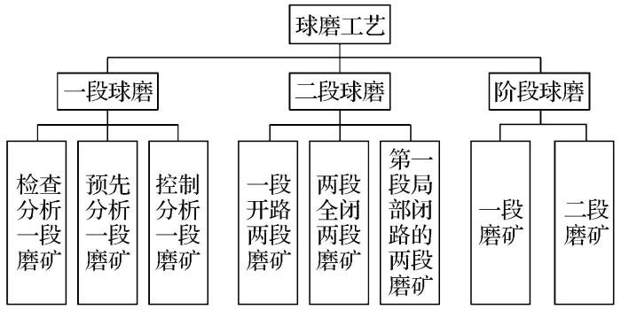 采用单元模块表达时,对于破碎和磨矿流程,可按照流程基本功能,划分为一段开路单元、一段带预选筛分或分级单元、一段带检查分级单元、一段带预先及检查分级单元以及一段带预先分级和检查分级单元5个基本流程单元,如图1(王毓华等,1995a)所示。对于浮选流程,则可以划分为粗选、精选、扫选和中矿集中点模块(王毓华等,2012)。
