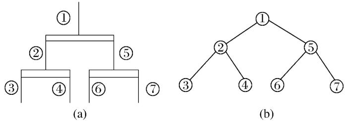 (1)对破碎、磨矿和浮选等工艺流程,可以只根据流程结构的不同特点进行单元绘制。如破碎与磨矿流程,可根据入料、出料和返回路径的不同,进行单元流程分类,借助计算机程序对单元流程按工艺要求进行组合得到所需破碎或磨矿流程(王毓华等,1995d)。浮选流程结构,则可采用“二叉树”原理进行描述,如图4所示(王毓华等,1995a)。