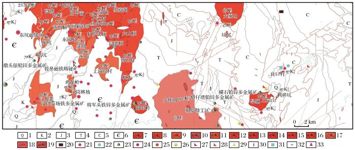 1.第四系;2.白垩系;3.侏罗系;4.三叠系;5.石炭系;6.寒武系;7.细粒多斑黑云母正长花岗岩;8.花岗斑岩;9.细粒斑状黑云母二长花岗岩;10.细粒多斑黑云母二长花岗岩;11.细粒含斑细粒黑云母二长花岗岩;12.细中粒含斑黑云母二长花岗岩;13.细中粒斑状黑云母二长花岗岩;14.细中粒斑状角闪黑云二长花岗岩;15.粗中粒斑状(角闪)黑云二长花岗岩;16.细粒少斑黑云母二长花岗岩;17.细粒含斑黑云母二长花岗岩;18.粗中粒含斑黑云母二长花岗岩;19.细粒含斑二云母碱长花岗岩;20.无烟煤;21.磁铁矿;22.铅;23.铜铅锌;24.钨;25.金;26.砂金;27.水晶;28.冰洲石;29.黄铁矿;30.白云母;31.石灰石;32.高岭土;33.萤石