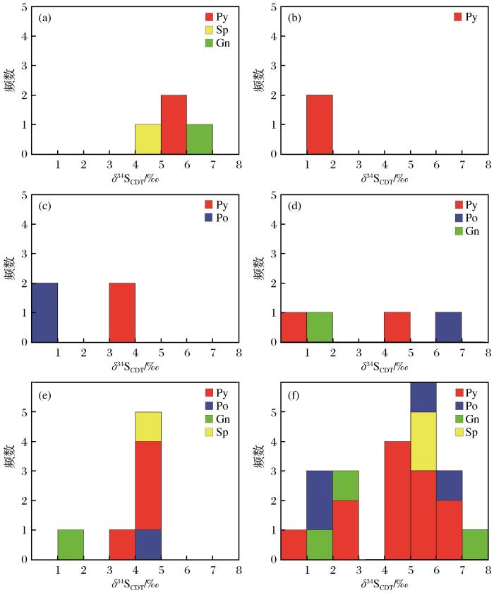 怀集地区代表性矿床硫化物δ34SCDT值分布直方图