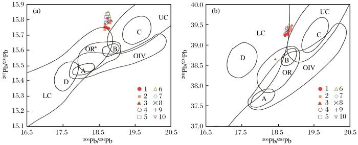 1-磁黄铁矿;2-黄铁矿;3-方铅矿;4-粗中粒斑状角闪黑云二长花岗岩;5-细中粒斑状黑云二长花岗岩;6-细中粒含斑黑云二长花岗岩;7-细粒含斑—细粒黑云母花岗岩;8-细粒多斑(细中粒)黑云母二长花岗岩;9-黑云角闪多斑花斑岩;10-黑云正长花岗岩;OIV-洋岛火山岩;OR-造山带;UC-上地壳;LC-下地壳;A、B、C、D分别代表该区域样品相对集中区