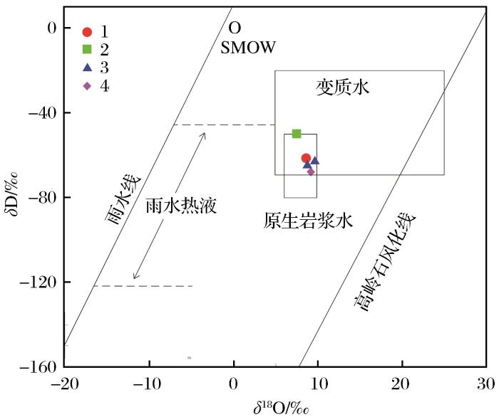 表4 怀集地区代表性矿床石英流体H、O同位素测试结果