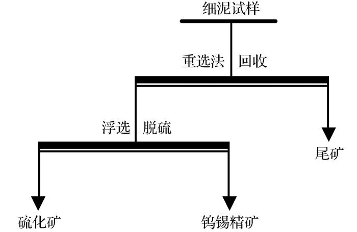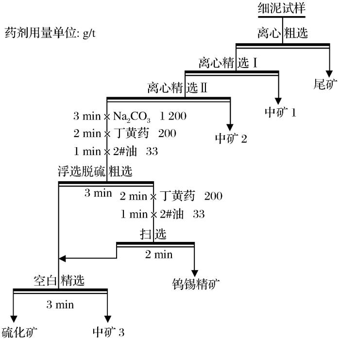 试验原则流程如图1所示。细泥试样中主要回收金属矿物钨锡矿与石英、方解石等脉石矿物的比重差异较大,可采用重选法回收钨锡矿物。首先开展了摇床重选和离心重选回收细粒级钨锡矿物的对比试验,发现离心选矿机设备在重选回收钨锡细泥方面具有优越性。然后对影响离心选矿机选别效果的矿浆给矿浓度、给矿时间和转鼓转速等参数进行条件对比试验,以获得离心重选回收细粒级钨锡矿物的适宜工艺条件。由于试样中S含量达1.55%,且硫化矿比重相对较大,在离心重选过程中易随钨锡一起富集在精矿中,从而影响钨锡精矿品质(黄云松等,2017)。因此,为获得合格的细泥钨锡精矿,需对离心重选精矿进行进一步浮选脱硫。最后,在前面各阶段试验的基础上,确定采用离心重选—浮选脱硫联合工艺回收细泥试样中的钨锡矿物,并进行了全流程开路试验。