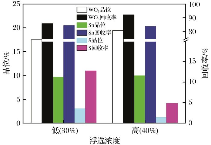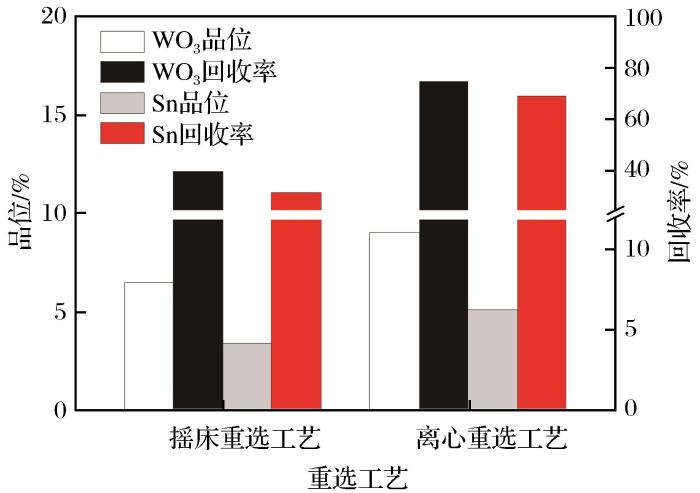 为保证精矿品位,试验中适当降低给矿浓度至15%、减小转鼓转速至250 r/min,将离心选矿机一次精选的精矿进行二次离心精选,可获得精矿产率为45.22%,WO3、Sn的品位分别为9.92%和5.50%,作业回收率分别为90.49%和85.02%的选别指标。