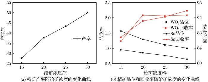 给矿浓度是影响离心选矿机选别效果的重要因素。给矿浓度低,有利于提高精矿品位,但影响回收率指标以及离心选矿机设备的处理能力;给矿浓度高,有利于提高处理量并保证回收率,但影响精矿品位。在给矿时间为60 s、转速为500 r/min、冲洗水为3.75 L/min的条件下,考察了给矿浓度对离心选矿机分选效果的影响,结果见图3。
