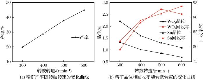由图4可以看出,随着转鼓转速的增大,精矿产率增大,WO3和Sn的品位呈下降趋势,而回收率呈升高趋势。这是因为转鼓转速的提高增大了矿物颗粒所受的离心力,使更多的微细矿物迅速离心沉降至转鼓内表面,从而成为精矿,所以产率和回收率均呈增大趋势(易凡等,2019);另一方面,转鼓转速的提高导致分选过程的选择性下降,使更多未解离的钨锡矿物和脉石进入精矿,从而降低了精矿品位。当转鼓转速低于400 r/min时,虽然精矿中WO3和Sn的品位较高,但回收率较低;当转鼓转速高于400 r/min时,精矿中WO3和Sn的品位较低,而回收率增幅较小,且精矿产率大,会增加下一步作业的入选矿量。为了保证WO3和Sn的回收率,同时兼顾缓解下一步精选作业的压力,选择转鼓转速为400 r/min。