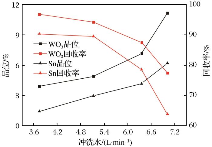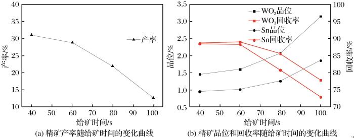 由图5可以看出,随着给矿时间的延长,精矿产率降低,WO3和Sn的品位逐渐升高,而回收率未见明显变化,当给矿时间大于60 s后回收率显著降低,尤其是Sn回收率下降更明显。主要原因在于离心转筒内壁容量有限,若给矿时间过长,易使转筒内壁过满,部分微细粒钨锡矿物随切向薄流膜旋出进入尾矿,致使WO3和Sn的回收率急剧降低。因此给矿时间选择60 s为宜。